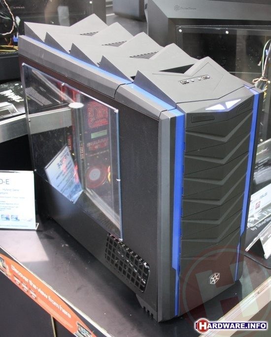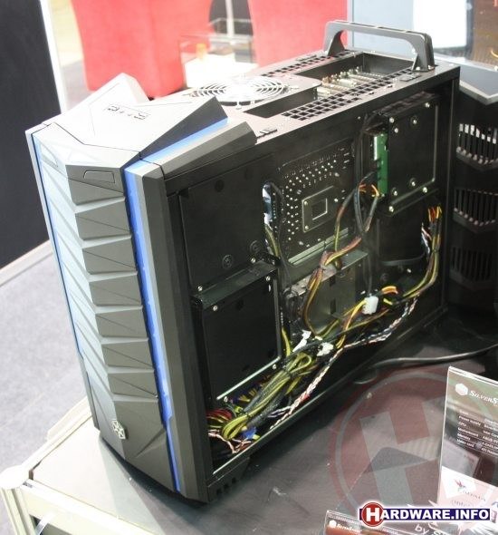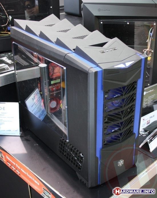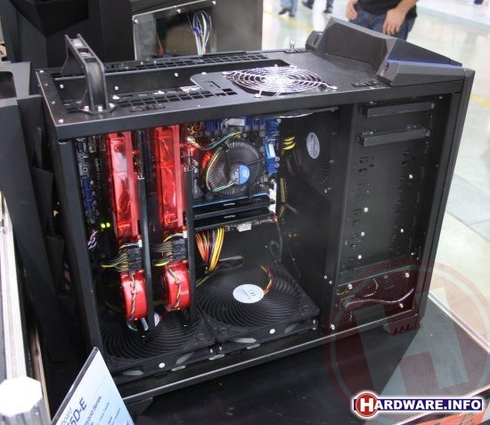 Новинка габаритами 235x510x578мм, изготовлен из стали толщиной 0.8мм. Материнская плата в этом корпусе крепится под углом в 90 градусов, что довольно оригинально, но не ново. Крупные вентиляторы AirPenetrator (две штуки, хотя по другим данным применяемые вентиляторы - Vortex) в полу шасси выдают мощный воздушный поток, идущий вдоль видеокарт и поперёк модулей оперативной памяти. Дизайн как всегда довольно интересный, но на мой взгляд слишком вычурный и резкий, впрочем судите сами.