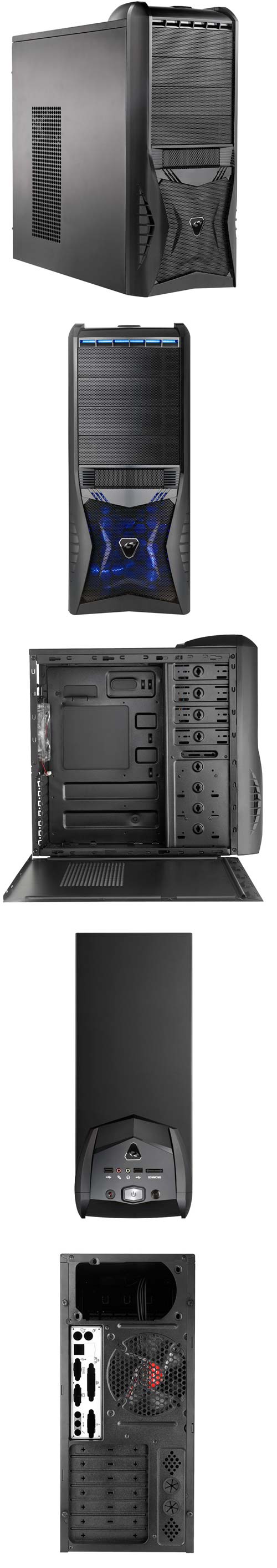 Новинка получила название Sonex 6010 и представляет собой Mid-Tower шасси, способное вместить в себя видеокарту длиной до 330мм. Сделан корпус из 0.6мм стали SECC, передняя панель перфорирована, отсеков для 5.25" устройств имеется четыре, а для 3.5" - шесть. На панели ввода/вывода находятся порты USB 2.0 (USB 3.0 опциональны) и SD/MMC/MS картридер, в фронтальной и задней частях Sonex 6010 имеются 120мм вентиляторы BlueStar с голубой светодиодной подсветкой. Отверстия для шлангов СВО и укладки кабелей имеются. Кулер с бэкплейтом можно установить без изъятия системной платы.