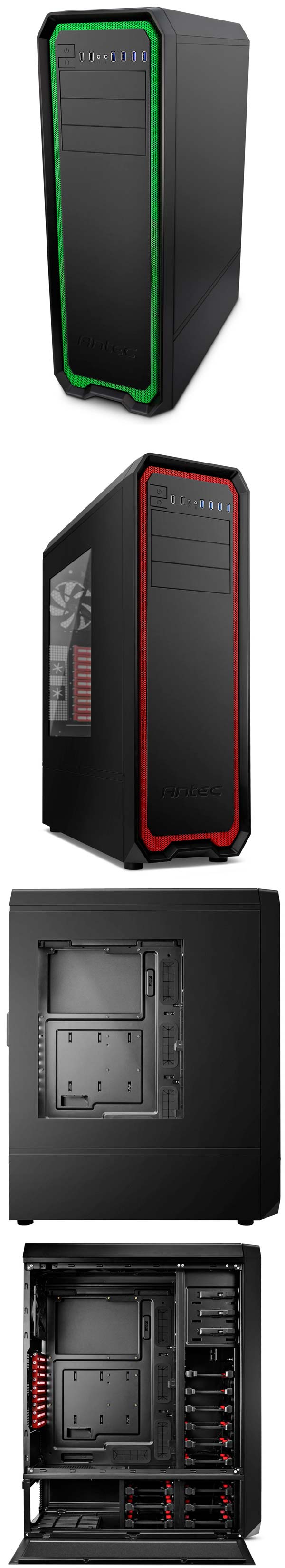 На панели ввода/вывода имеются четыре порта USB 3.0 и два порта USB 2.0, про аудио коннекторы в Antec тоже не забыли. Вырез в поддоне системной платы очень велик, возможности для укладки кабелей имеются, на задней стенке шасси есть отверстия для шлангов СВО. Отличительной чертой новинки является возможность установки внутрь двух блоков питания ATX.
