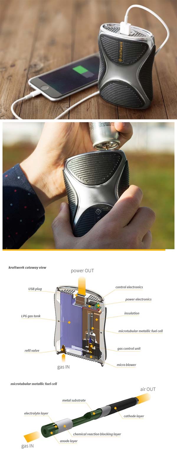 Что делает kraftwerk уникальным аппаратом? Источником электроэнергии для зарядки смартфонов, планшетов и т.д. выступает не литий-ионная или какая-либо иная батарея, а микротрубочковые металлические топливные элементы, которые и нужно заправлять kraftwerk, для подачи материала используется что-то вроде аэрозольного распылителя.