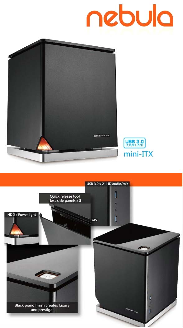 Название новинки - Nebula, что переводится как "туманность" (в космических масштабах). Размеры корпуса составляют 206x330x206мм, вес и материал изготовления не указываются. Данное шасси совместимо лишь с системными платами форм-фактора Mini-ITX, у него два слота расширения.