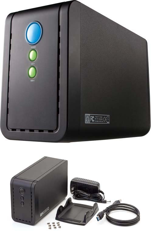 Цвет корпуса изделия - чёрный, аппарат имеет сертификаты RoHS и PSE, в комплекте с девайсом идут винтики для крепления HDD внутри (видимо, ни о какой горячей замене не стоит и мечтать), а также адаптер питания, подставка и кабель USB, инструкция тоже имеется в коробке. На корпусе новинки есть кнопка включения и светодиоды активности для каждого из установленных внутри HDD.