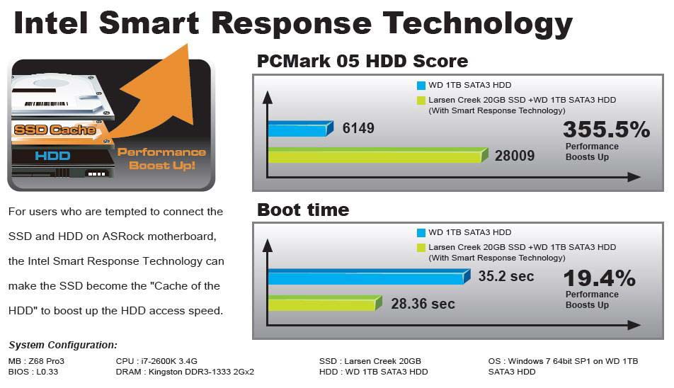 В презентации технологии, что высылалась партнёрам, говорилось, что накопитель Larson Creek вместе с винчестером Western Digital на 1ТБ показывали при использовании SRT завидные результаты - прирост производительности в тесте HDD в бенчмарке PCMark 05 составил 355.5%, время загрузки системы уменьшилось на 19.4%, что тоже неплохо. Конечно же, SRT никак не связана именно с SSD 311-й серии, в качестве дополнения к винчестеру может работать и любой другой накопитель (давая и больший прирост, чем озвучен выше), лишь бы его ёмкость не превышала 60ГБ. Сам Larson Creek будет только в 20ГБ варианте, так что на что-то кроме как для кеширования, он вряд ли сгодится (впрочем, если в качестве ОС выступает Windows XP, то ещё не всё потеряно).