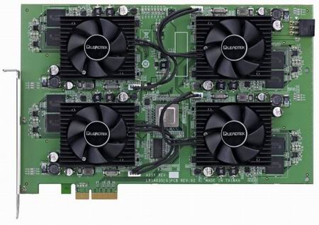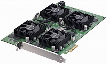 Понятное дело, что для игр такая карточка не предназначена. "Видяха" подключается к PCIe x1, питается от одного шестипинового коннектора от БП, несёт на себе сразу четыре чипа SpursEngine, на каждый из которых нахлобучено по 40мм (поправьте, если ошибаюсь) вентилятору. Довольно спорное по эффективности охлаждения решение, впрочем мне не известно тепловыделение SpursEngine, возможно и 40мм вентилятор прекрасно справляется с своей функцией, а более эффективные СО не были применены из-за своей стоимости.