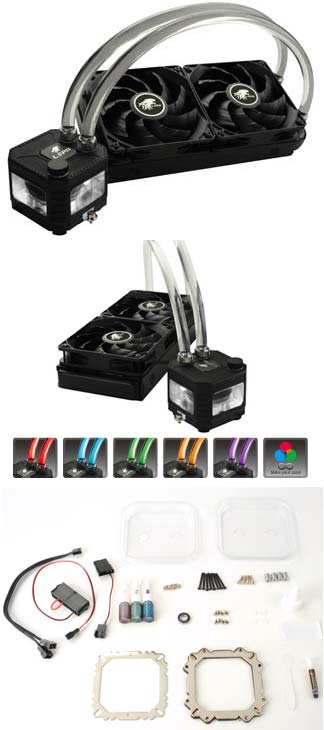 Аппарат именуется EXllusion 240 (модель LPWEL240-HF), он совместим со всеми современными процессорами Intel (LGA775 / 1150 / 1151 / 1155 / 1156 / 1366 / 2011) и AMD (AM2 / AM2+ / AM3 / AM3+ / FM1 / FM2 / FM2+). Устройство весьма стандартной конструкции - 240x120мм радиатор с парой 120мм вентиляторов на нём, водоблок совмещённый с помпой, всё это дело соединено шлангами.