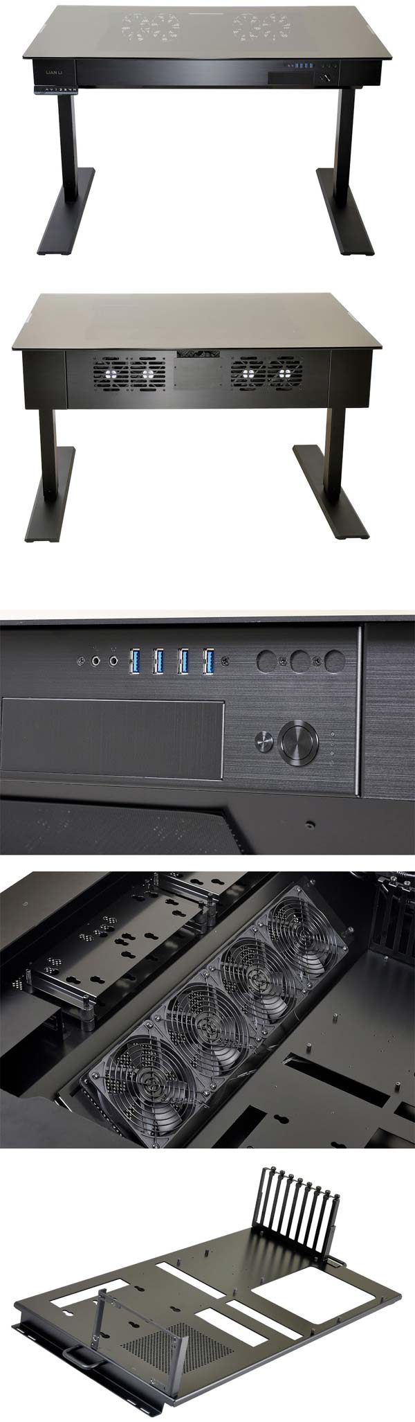 Стол/корпус Lian Li DK-04 совместим с материнскими платами форм-факторов ATX и microATX, обладает четырьмя 120мм вентиляторами с фронта и четырьмя с тыла, на панели ввода/вывода можно найти четыре порта USB 3.0 и HD аудио коннекторы. Новинка совместима с блоками питания ATX, лимит на длину видеокарты - 320мм, на высоту процессорного кулера - 140мм, на радиатор СВО: 120x480 и 120x240мм.