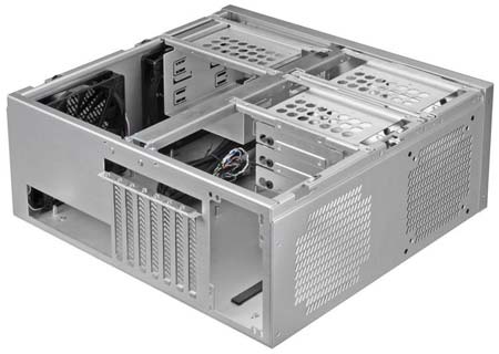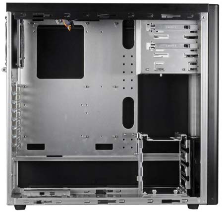 Отсеков для 5.25" устройств два, а мест для установки 3.5" винчестеров/SSD - шесть, причём половина может использоваться для установки 2.5" накопителей. Вентиляторов три штуки, все 140мм. Двое располагаются спереди, один - на верхней стенке.