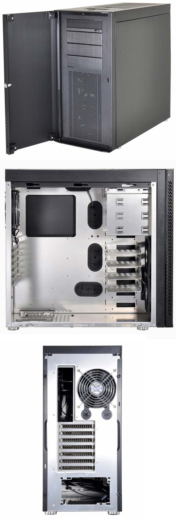 PC-B16 является изделием класса Mid Tower, оно совместимо с системными платами форм-факторов ATX и microATX, сделано целиком из алюминия, весит 6.5КГ и имеет размеры 490x530x230мм. У аппарата четыре внешних отсека для 5.25" устройств, а мест для крепления 3.5" и 2.5" накопителей пять штук. Количество слотов расширения равно семи.