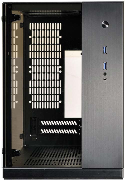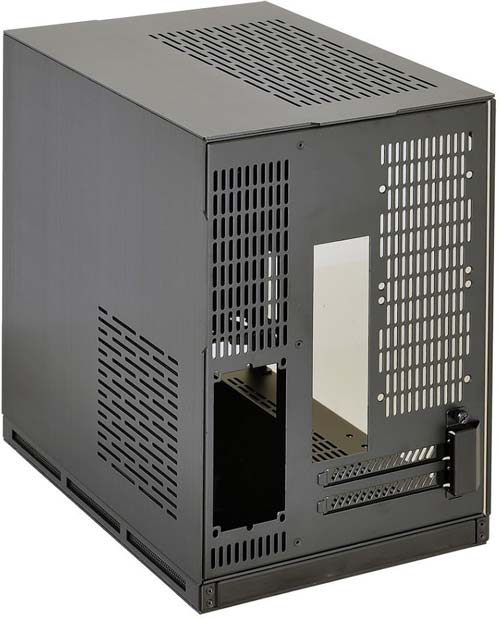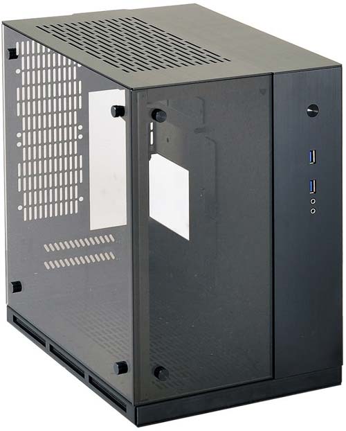 У новинки отсутствуют внешние 5.25" и 3.5" отсеки, но есть по два места для 2.5" и 3.5" накопителей, слотов расширения тоже два. Цвет изделия - чёрный, на панели ввода/вывода можно найти два порта USB 3.0 и HD аудиовход и аудиовыход.