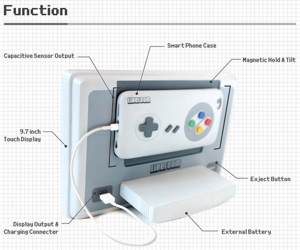 Диагональ экрана Libercom152 составляет 9.7", разрешение - 1080p. Чтобы смартфон/фаблет держался на новинке, предусмотрены футляры, с помощью которых умные девайсы и крепятся к продукту Livercom. Форма и цвет всего этого дела выполнены в виде Super Nintendo, что обязательно понравится олдгеймерам.