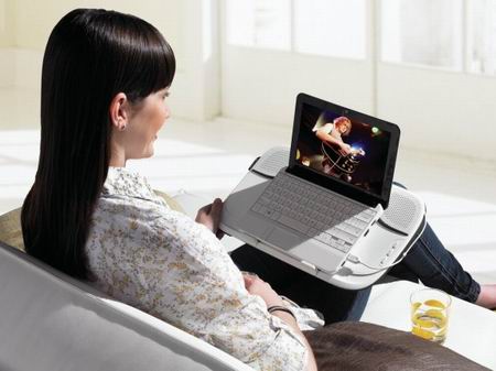 В самом деле устройство может оказаться полезным, ведь редко в какой портативный компьютер встраивают более-менее качественные колонки, да и работать с ноутбуком на коленях - не самое удобное занятие. А благодаря Speaker Lapdesk N550 решаются обе этих проблемы. Колонок у девайса две, то бишь звук стерео. Подключение осуществляется через USB. Чтобы понять как выглядит и работает N550, достаточно посмотреть на фото чуть ниже.