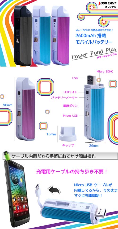 Ёмкость батареи, находящейся внутри Power-Pond Plus, составляет 2600 мАч, изделие может пополнять заряд подключённых к нему устройств по USB и micro USB. Новинка может быть использована и в несколько необычной роли, продукт Look East можно задействовать в качестве картридера microSD/SDHC карточек, соответствующий слот имеется на корпусе изделия.