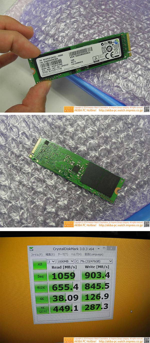 Удовлетворять спрос будет масса компаний, а пока мы посмотрим на творение Samsung, именуемое XP941. Японцы с Akiba PC Hotline получили возможность сфотографировать новинку из Южной Кореи и провести на ней один тест. Первое поколение M.2 аппаратов использует пропускную способность интерфейса PCI-Express 2.0 x2, лимит на передачу данных в котором составляет ~1000МБ/с, однако творение Samsung использует PCI-Express 2.0 x4.