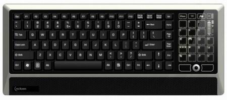 Итак - перед нами довольно стильная беспроводная клавиатура, стоимостью 130 долларов США. Работает она от литий-ионной батареи до 20 часов без подзарядки. Клавиши выполнены в ноутбучном Low profile стиле, имеется белая подсветка и сенсорная панель для клавиш-шорткатов (они служат для быстрого доступна к браузерам, медиа-проигрывателям и прочей ерунде) на которой ещё и трэкболл имеется (замена мыши, опять же очень часто используется в ноутбуках).