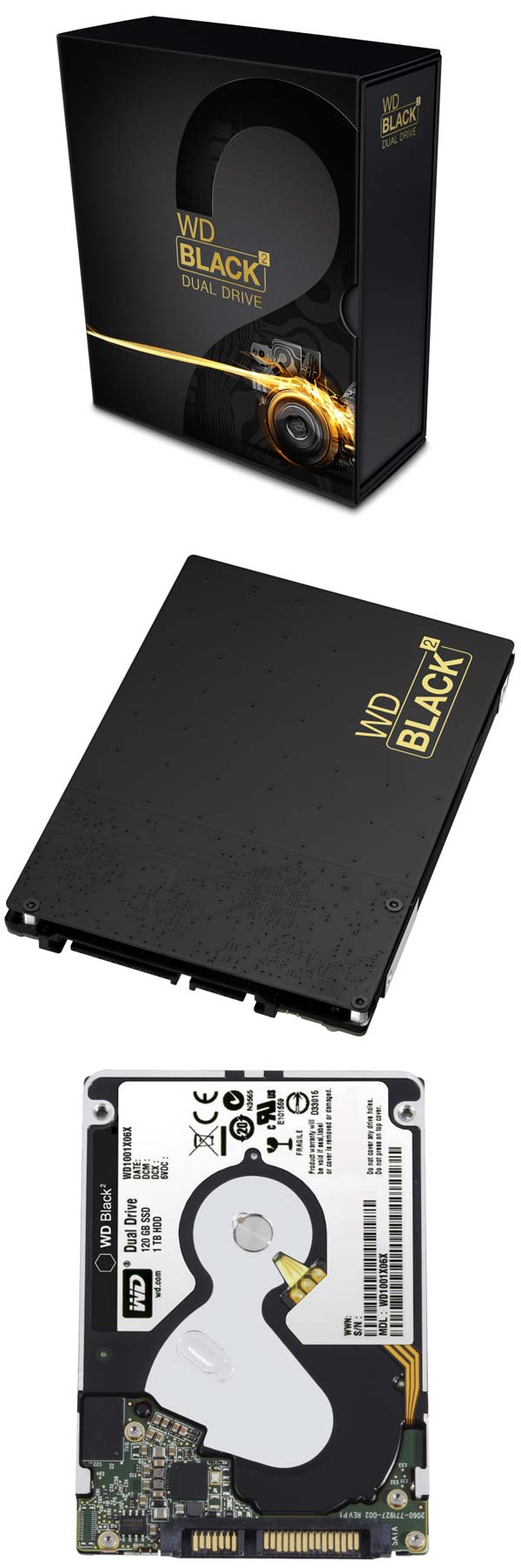 На рынке и раньше встречались гибридные накопители, но WD Black2 превзошёл их всех. В данном аппарате сочетаются 1ТБ винчестер и 120ГБ твердотельный накопитель. Новинка имеет форм-фактор 2.5", толщина корпуса составляет 9.5мм, т.е. в ультрабуки такое решение не влезет, но отлично подойдёт в ноутбуки.