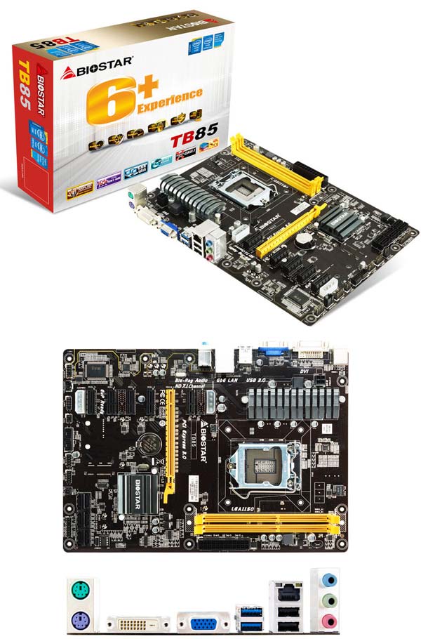 Оснащена материнская плата Biostar TB85 и PS/2 портами для мышки и клавиатуры, видеовыходами DVI и D-Sub/VGA, тремя аудио коннекторами, хедерами для подключения вентиляторов. Комплектуется новинка софтом BIO-Remote2, Smart Speed LAN, идёт в комплекте с двумя кабелями SATA, диском и инструкцией.