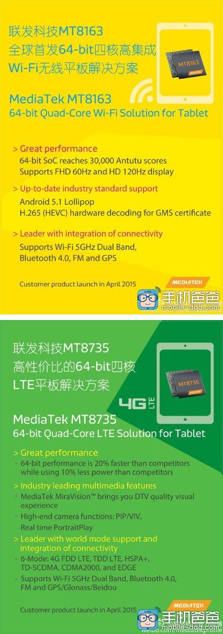 Новинки именуются MT8163 и MT8735, обе SoC созданы специально для планшетов, обе имеют 64-разрядную архитектуру. Первая новинка не имеет поддержки сотовой связи, дружит лишь с Bluetooth и WiFi, использует процессорные ядра Cortex-A53 (четыре штуки), способна декодировать видео в H.265, поддерживает GPS/ГЛОНАСС/Beidou, дружит с 60Гц и 120Гц экранами. Вторая SoC более продвинутая, ибо имеет LTE модем с поддержкой FDD-LTE, TDD-LTE, WCDMA, CMDA2000 и GSM. Всё остальное в MT8735 на уровне описанной выше SoC.
