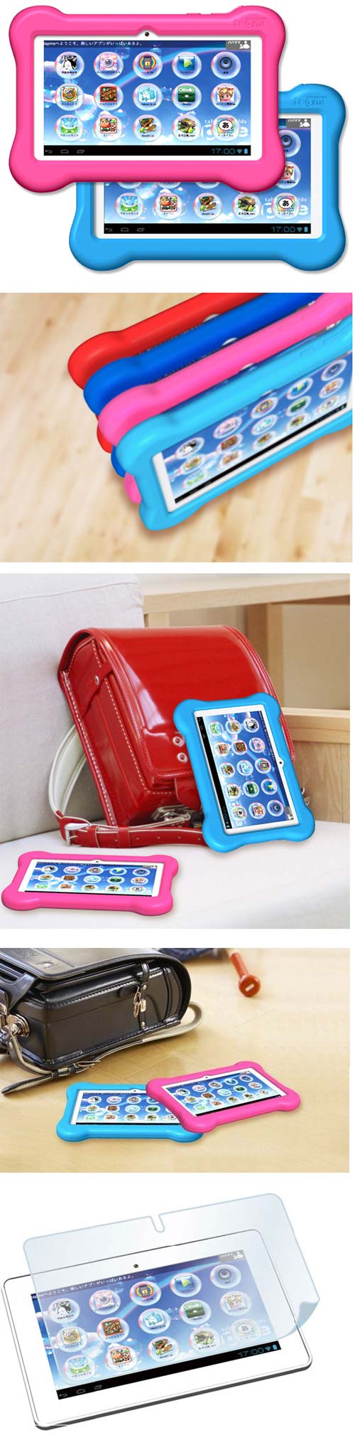 У детского планшета есть 2МП задняя и 0.3МП фронтальная камеры, порт micro-USB, 3.5мм аудио выход, аппарат поддерживает WiFi, питается от литий-ионной батареи на 2400 мАч, управляется Android 4.0. Разумеется, в память устройства загружены различные образовательные и развивающие программы и учебные пособия, но так как они на японском, мы их касаться не будем.