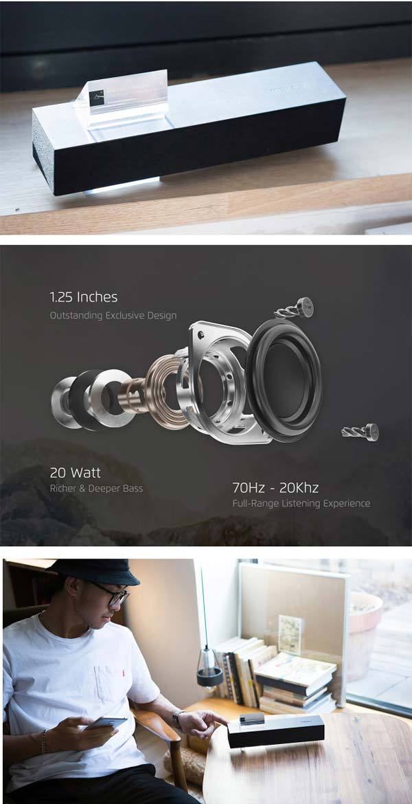 Решение называется Gravity, своим выдающимся внешним видом в стиле "дзен" устройство обязано буддистскому японскому дизайнеру Kosho Tsuboi. Аппарат основан на 4-ядерной SoC Allwinner R16, использует PMU AXP223, 512МБ оперативной памяти и 4ГБ eMMC флеш памяти. Микросхема усилителя мощности - TAS5754M, также задействовано WiFi (b/g/n) + BT + FM решение AP6212.