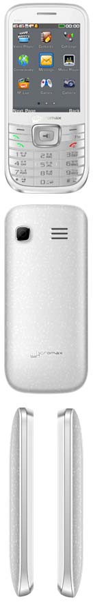 Время работы в режиме разговора составляет 11 часов, а в режиме ожидания - до 700 часов. Продукт Micromax обладает слотом для microSD карточек, лимит на их объём равен 8ГБ. Цвет корпуса аппарата - белый, WAP поддерживается, возможен просмотр видео в форматах 3GP, mp4, а также прослушивание звука в MIDI, MP3, AAC и WAV.