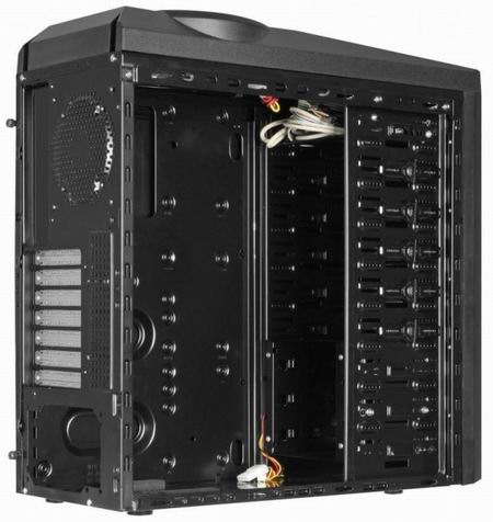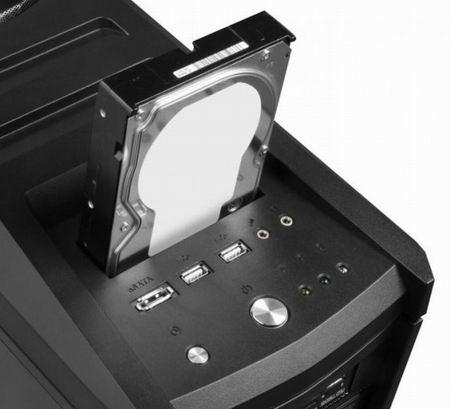 В новинке пять отсеков для 5.25 дюймовых устройств, в верхней передней части корпуса находятся коннекторы USB 2.0, eSATA и аудио вход/выход. Приятной особенностью шасси является то, что производитель не поскупился и установил мультиформатный картридер в верхний отсек корпуса. Для обдува внутренностей ПК предусмотрены два вентилятора - 120мм спереди с LED-подсветкой и 180мм на верхней стенке корпуса. Имеются места для установки пары 120мм вентиляторов на боковую панель и на выдув (на заднюю стенку). В верхней части корпуса также имеется док-станция, в которую можно засунуть (в прямом смысле слова) 3.5 дюймовый жёсткий диск, не знаю как Вам, уважаемые читатели, но мне немного непривычно видеть такие навороты.