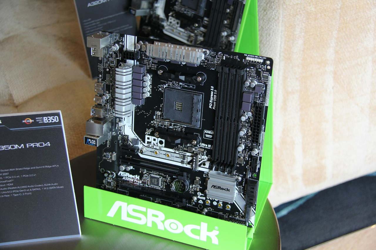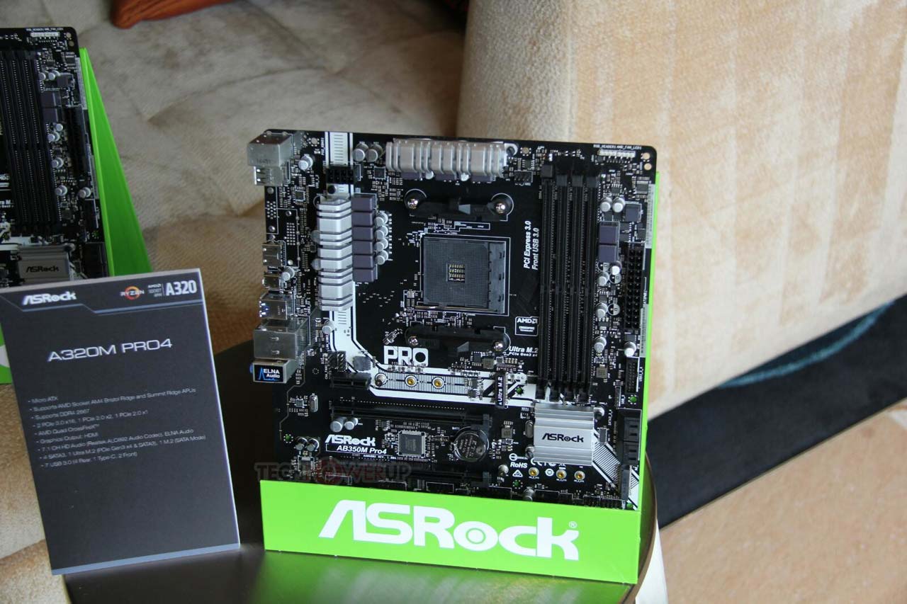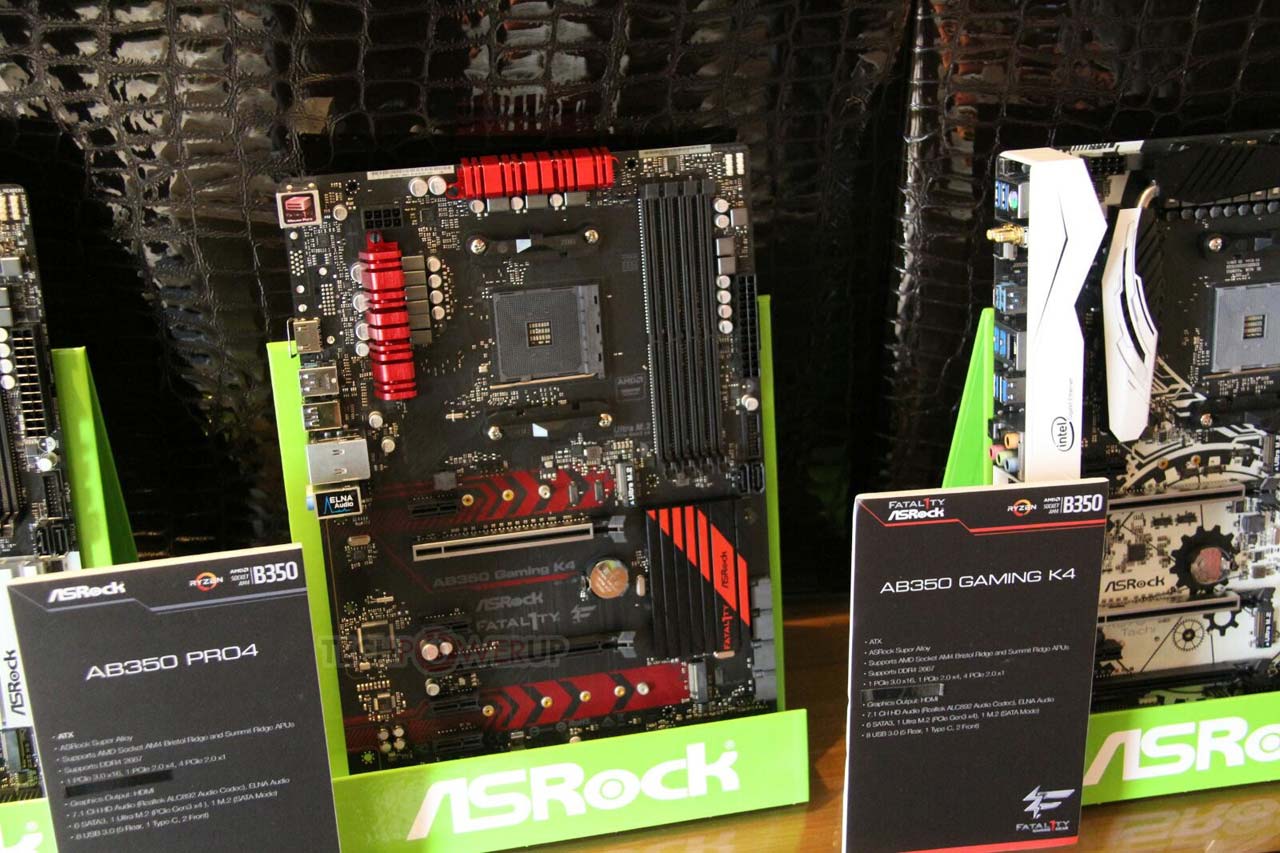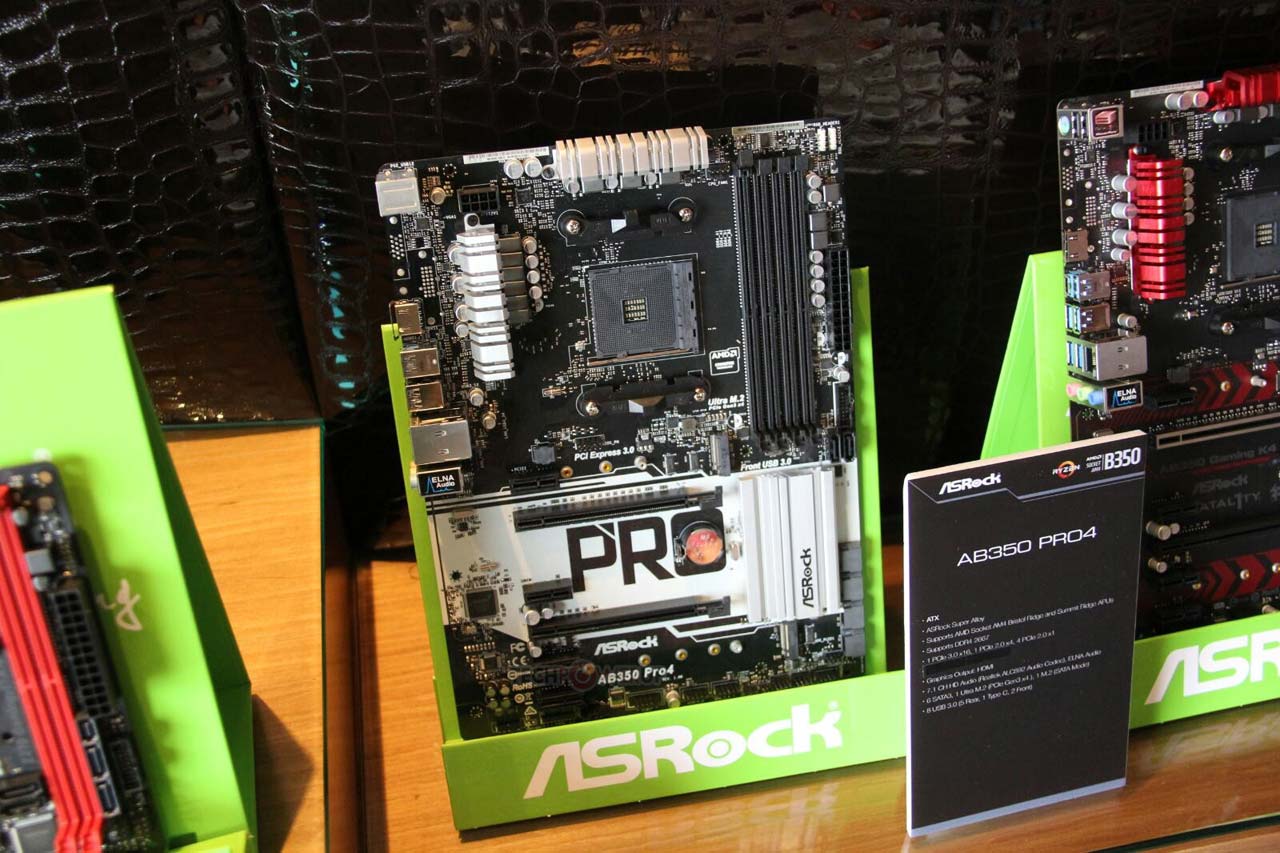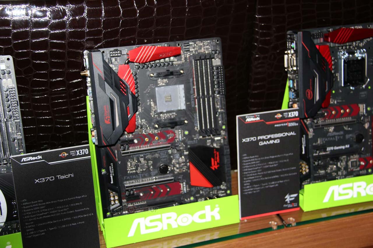 Теперь посмотрим на творения ASRock, нам показывают X370 Taichi, X370 Professional Gaming, AB350 Pro4 и A320M Pro4 на пару с AB350M Pro4: