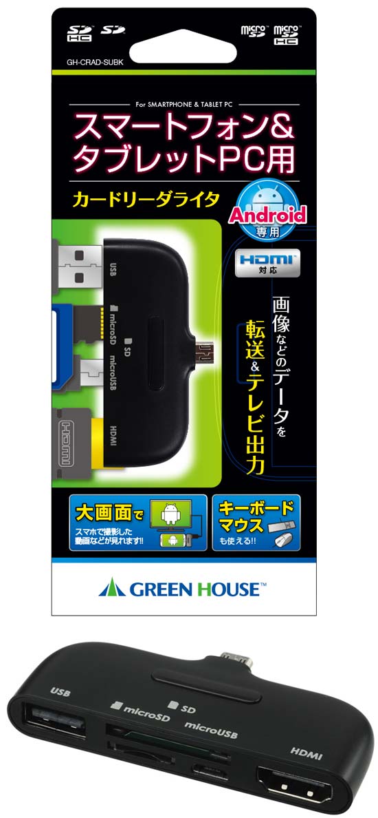 На самом деле GH-CRAD-SUBK не является одним лишь картридером, этот девайс может многое, его функционал порадует владельца. Подключив новинку к смартфону или планшету с ОС Android, можно дать аппарату доступ к картами памяти SD и microSD, порту USB или microUSB, а также HDMI, по которому можно вывести изображение на большой экран.