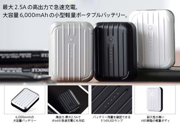 В комплекте с изделием идёт USB (micro USB - USB A) кабель, новинка совместима с iPad, iPhone, iPod Touch и многими другими гаджетами и девайсами. Доступные цвета прочного АБС пластикового корпуса изделий - чёрный, белый и серебристый. На шасси новинок из Японии имеются светодиоды (их пять), обозначающие уровень заряда батареи.