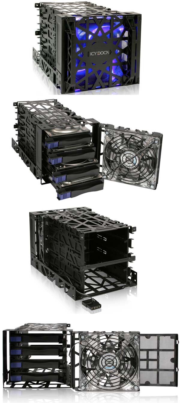 Данный агрегат помещается в корпус ПК, в котором занимает три 5.25" отсека, их он преобразовывает в хорошо охлаждаемые четыре установочных места для 3.5" накопителей. Новинка позволяет легко вынимать винчестеры из себя и так же легко их туда устанавливать - и всё это без разбирания корпуса ПК. Охлаждение накопителей осуществляется тихим 120мм вентилятором. Размеры: 223x145x126мм, вес - 904 грамма.