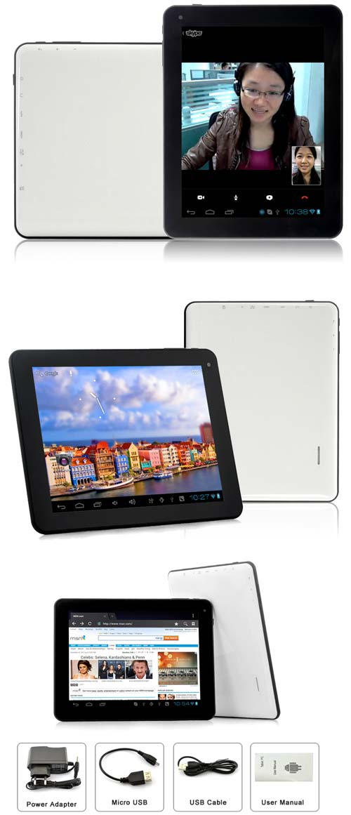 У планшета есть порт micro USB, слот для карточек microSD, вход для микрофона, встроенный динамик, а также видеовыход HDMI. Китайский агрегат оснащён акселерометром и гироскопом. Габариты продукта составляют 200x155x12мм, вес равен 400 граммам.