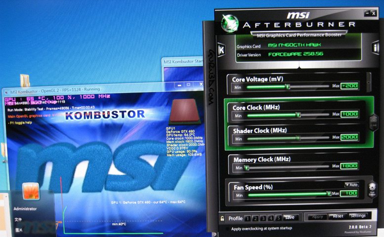Скриншот ниже вселяет уверенность - впервые мы видим частоту ядра на отметке 1000МГц, а шейдеры на 2000Мгц. Если каждый экземпляр MSI GTX460 HAWK будет поставляться с таким разгоном (или иметь схожий потенциал) - то карта однозначно станет хитом, т.к. равных ей по характеристикам нет, даже "Зверь" от TGT отстаёт.