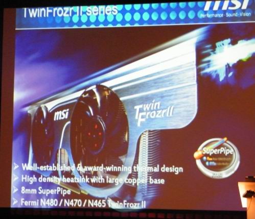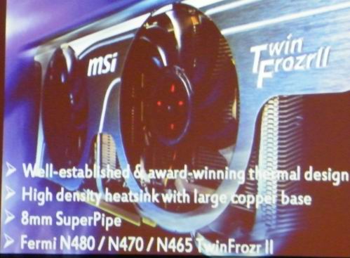 Вряд ли кто-то стал бы сомневаться в том, что раз у производителя есть какое-то особое универсальное решение по охлаждению, он станет применять его на всех своих продуктах. У компании MSi такое решение называется Twin Frozr II, уверен что многие из Вас, уважаемые читатели с ним знакомы - благо его куда только не ставили : и на GeForce GTX275 и на Radeon 5770/5830/5850/5870, возможно куда-то ещё. Теперь пришла пора пришпандорить его в Fermi, дабы охладить их горячий нрав.