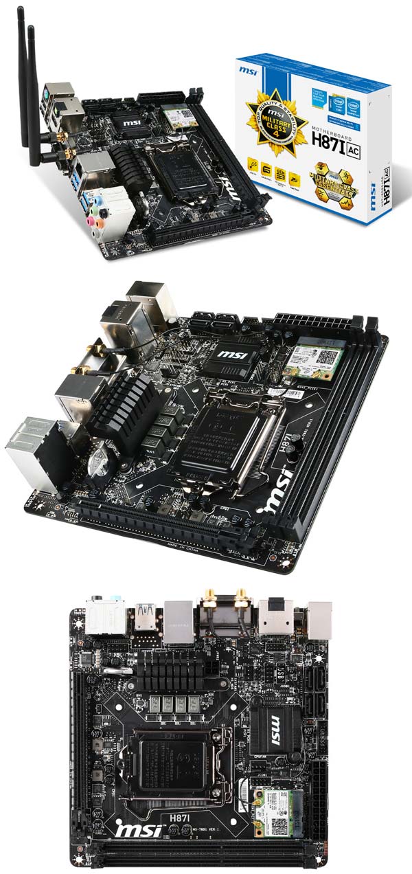Изделие называется H87I AC, базируется на чипсете H87 Express, совместима с процессорами LGA1150, имеет два слота для оперативной памяти DDR3 (16ГБ - максимум), один PCIe x16, один Mini PCI-E, четыре SATA 6Гб/с (с поддержкой организации массивов RAID 0, 1, 5, JBOD, 0 +1), один PS/2, четыре USB 3.0 и два USB 2.0.