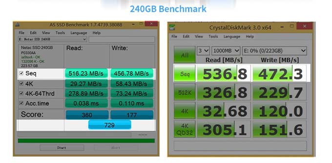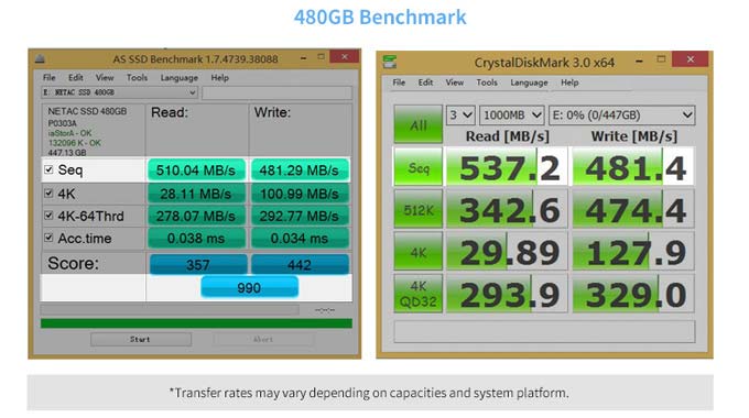 Устройства дружат с TRIM, S.M.A.R.T., выравниванием износа, имеют SLC кеш. Скорость передачи данных у 240ГБ модели составляет 536/472МБ/с, в то время как у 480ГБ модели чтение достигает 537МБ/с, а запись - 481МБ/с. Увы, показатель IOPS нам не раскрывают.