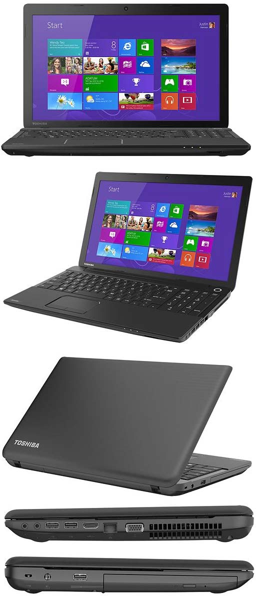 Изделие называется Satellite C55T-A5314, оно имеет размеры 15x9.5x1.4 дюйма и весит 5.4 фунта. В качестве процессора используется двухъядерный Core i3-3120M, работающий на тактовой частоте 2.5ГГц, оперативной памяти имеется 4ГБ, её тип - DDR3-1600 SO-DIMM, возможно расширение до 16ГБ.