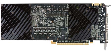 Посмотрим на характеристики и фотографии эталонной карточки от Nvidia. Новинка выполнена на одной печатной плате, на которой расположились два графических ядра GF110, изготовленных по 40нм тех.процессу, а также 3ГБ GDDR5 памяти с 2х384-битным интерфейсом. Количество CUDA-ядер - 1024, текстурных блоков - 128. Система охлаждения - двухслотовая, в ней используются пара испарительных камер (для каждого из графических чипов). Частоты следующие: 607/1215/3414МГц (ядро/шейдеры/память). Питание осуществляется по двум 8-и пиновым коннекторам, энергопотребление находится на отметке 365 ватт. Из видеовыходов предусмотрено три DVI и один mini DisplayPort, имеется поддержка SLI, максимум - 2-way. Стоимость, установленная Nvidia - 699 долларов США.