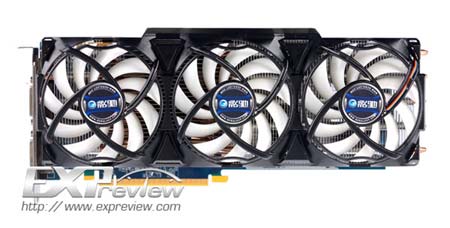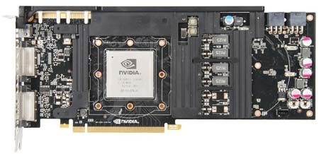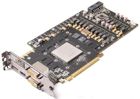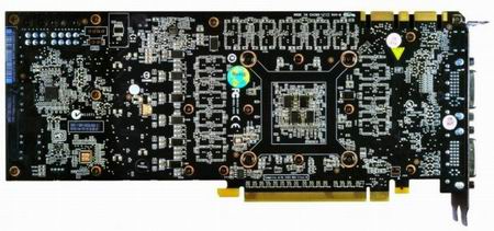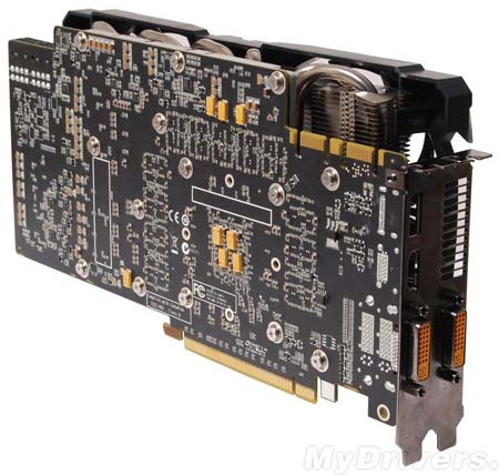 Полностью нереференсный GTX580 с четырьмя вентиляторами. Шутка, увы. Референсная модель - и по внешности и по частотам.