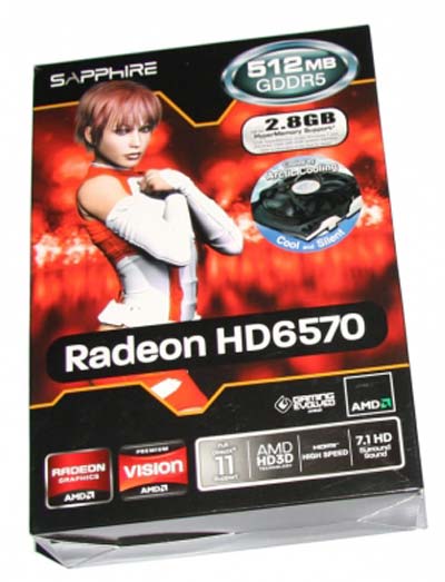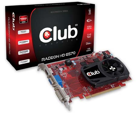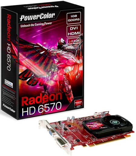 Младший братец (HD 6570) может похвастаться 480 потоковыми процессорами, 24 текстурными блоками и 512МБ GDDR5 памяти со 128-битным интерфейсом или же 1ГБ DDR3 памяти. Частотная формула скромнее, чем у 6670: 650/4000Мгц (ядро и память). Энергопотребление - 44 ватт (DDR3-вариант) и 60 ватт (GDDR5), охлаждение активное. Рекомендуемая стоимость - 79 долларов США.