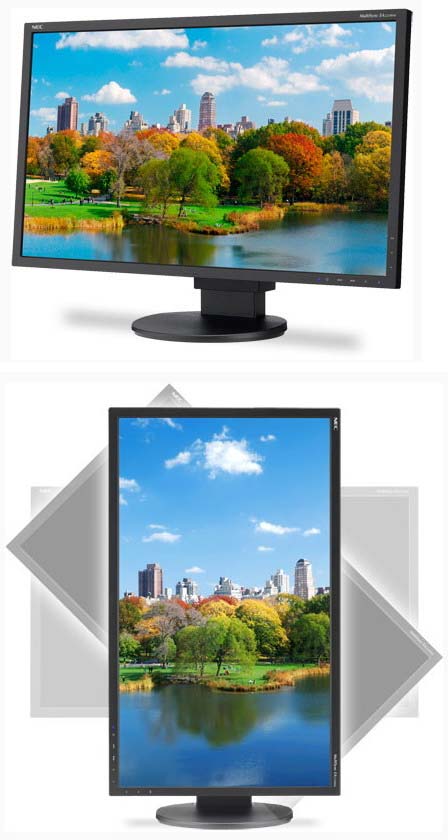Подставка монитора позволяет менять высоту его экрана по отношению к пользователю (максимум, насколько можно поднять экран монитора - 130мм), угол наклона, а также поворачивать его на 90 градусов. Управление настройками новинки осуществляется с помощью экранного меню с тач-контролем. Настройки (пресеты) можно создавать и быстро восстанавливать, причём сразу на 6 мониторах серии MultiSync EA, с помощью "фичи" ControlSync.