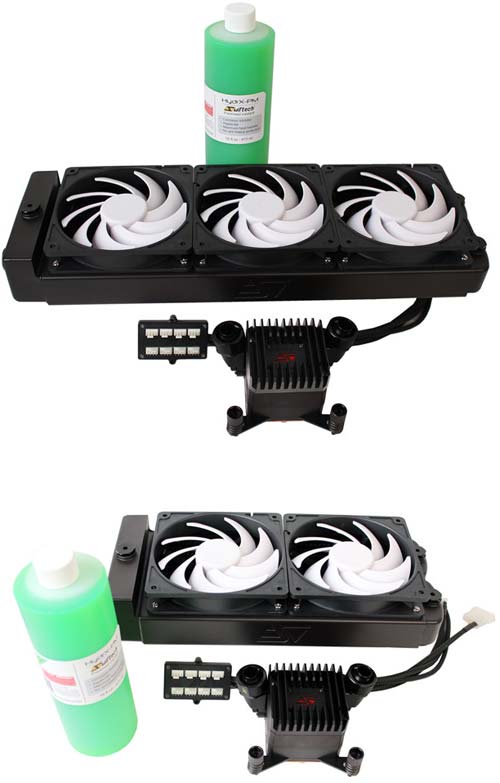 Как можно понять новинки идут с двумя и тремя установленными 120мм вентиляторами, говоря конкретнее - используется Helix 120мм, управляемый по методу PWM. В комплекте с СВО идут нужные шланги, да 500мл хладагента Swiftech HydrX. Думаю, что эффективность этих решений переплюнет многое из того, что есть на рынке СВО закрытого типа.