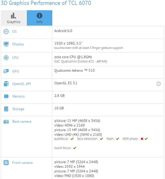 Вот скриншот с GFXBench, рассказывающий об Alcatel OneTouch Idol 4 (TCL 6070)