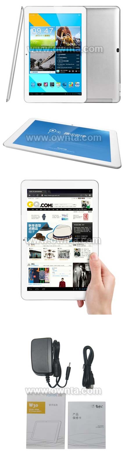Изделие называется Ramos W30, это планшет с 10.1" IPS Multi-Touch экраном, разрешение которого составляет 1280x800 пикселей. Поддерживается 5-и точечный ввод, дабы общение с ОС Android 4.0.3 было более продуктивным. Углы обзора дисплея - 170 градусов по горизонтали и вертикали.