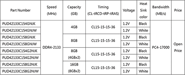 Изделия оснащены белыми/чёрными радиаторами, производитель решил пока что представить только модели с тактовой частотой 2133МГц, как отдельные 4ГБ модули, так и наборы из 2x4ГБ и 2x8ГБ, задержки - 15-15-15-36, рабочее напряжение - 1.2 вольт. Список изделий доступен в табличке ниже: