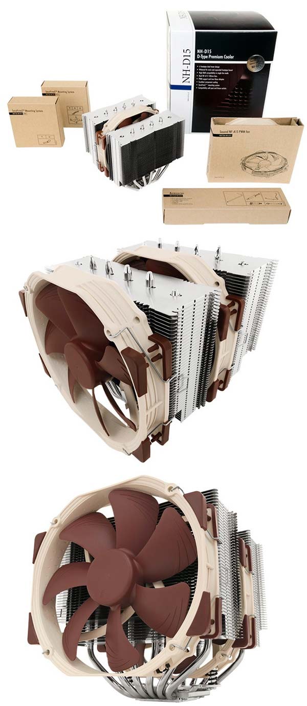 Радиатор обдувает пара вентиляторов Noctua NF-A15 PWM (300/1200/1500 об/мин, 115.5 - 140.2 м³/ч, 19.2 - 24.6 дБ), срок службы которых равен 150000 часам. В комплекте с кулером идут два LNA адаптера (резисторы, уменьшающие скорость вращения лопастей вентиляторов), Y-образный кабель, термопаста NT-H1, набор креплений SecuFirm2 и металлический значок для корпуса Noctua.