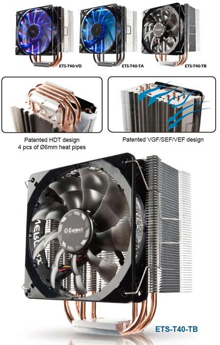 - ETS-T40-TA ($49.99) - имеет никелированный радиатор, оснащён вентилятором T.B.Apollish (26 децибел максимум) с голубой светодиодной подсветкой