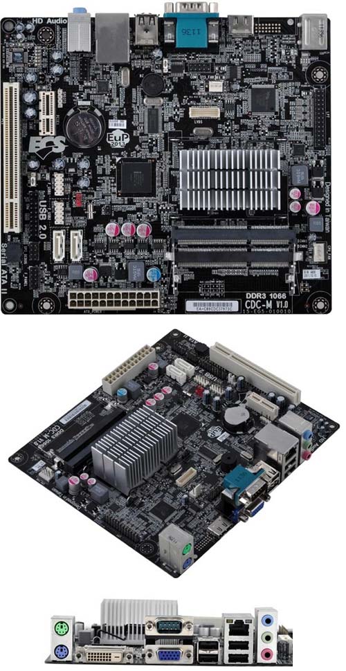Питается новинка от 24-х пинового ATX коннектора, слотов для оперативной памяти DDR3 SO-DIMM у изделия два, PCI-Express 2.0 x1 и PCI - по одному. Как это часто бывает с системными платами небольших размеров обладающими интегрированными процессорами, "материнку" обделили SATA портами - их всего две штуки, оба - 3Гб/с. У изделия ECS также имеется один гигабитный Ethernet порт, аж восемь USB 2.0 (хотя половина реализована через хедеры), видеовыходы DVI и D-Sub/VGA. Звук решения 6-и канальный.
