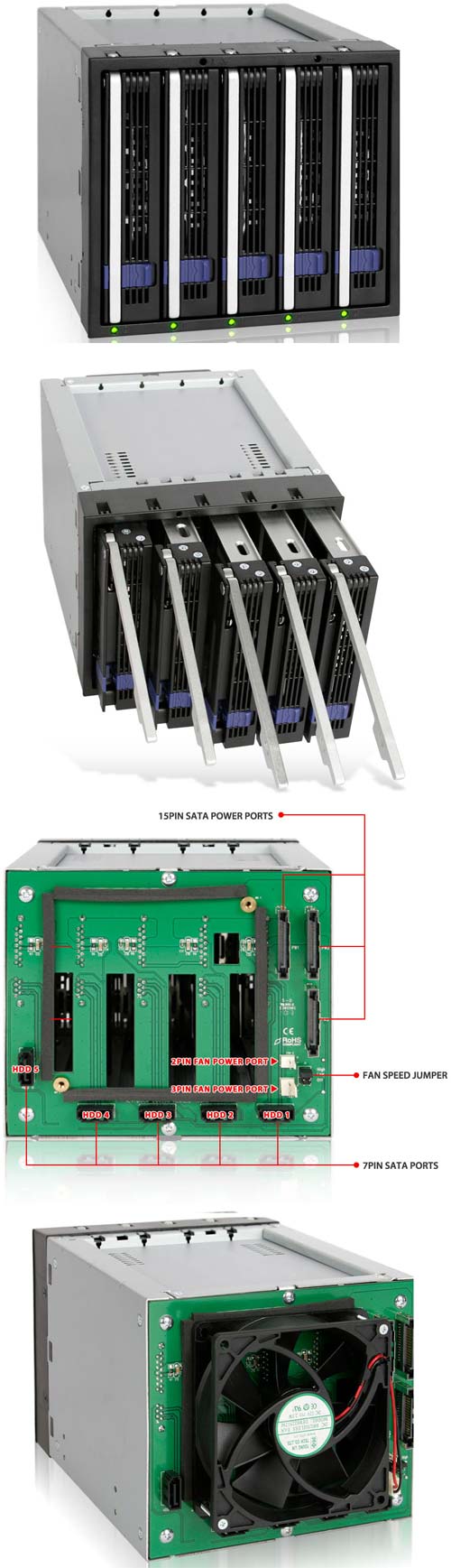 Аппарат называется FatCage MB155SP-B, он вмещает в себя до пяти 3.5" SATA I/II/III накопителей, занимает три 5.25" отсека в ПК и поддерживает функцию SATA Hot-Swap. Охлаждением винчестеров внутри "толстой клетки" занимает 92мм вентилятор, установленный с обратной стороны новинки.