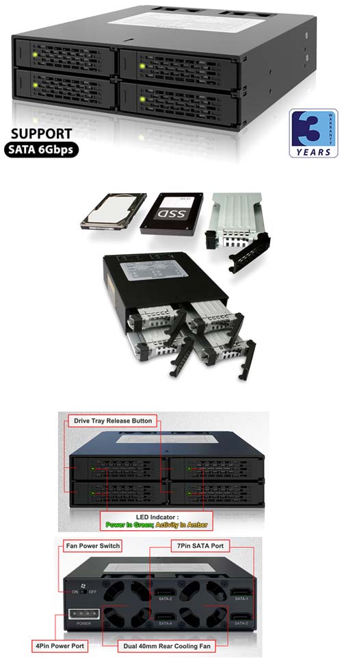 Девайс получил имя MB994SP-4SB-1, он представляет собой эдакую корзину для накопителей, которая помещается в 5.25" отсек ПК, а уж в неё пользователь волен установить до четырёх 2.5" SSD или же винчестеров одновременно. Причём поддерживаются модели с подключение по SATA 6Гб/с, что вдвойне приятно для владельцев быстрых твердотельных накопителей.