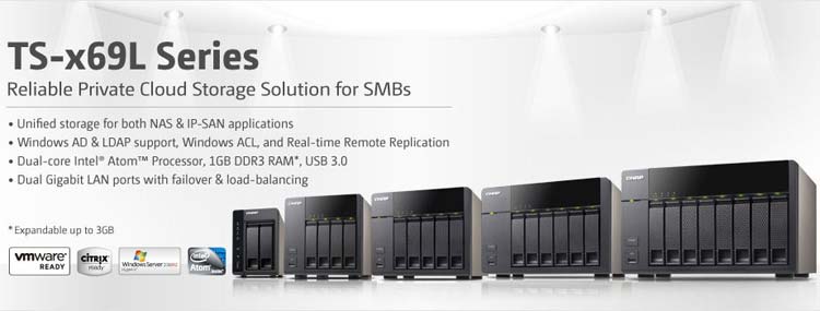 Серия устройств именуется TS-x69L, относятся девайсы к семейству Turbo NAS. Всего новинок пять: TS-269L, TS-469L, TS-569L, TS-669L и TS-869L. Цифра в названии девайса, стоящая до "69" показывает количество 2.5" или 3.5" накопителей (любого типа с SATA подключением), что поместятся в тот или иной NAS серии, т.е. в новинки от QNAP можно поместить от двух до восьми накопителей, ёмкостью до 4ТБ каждый. Неплохо бы организовать файловое хранилище на 32ТБ, правда?