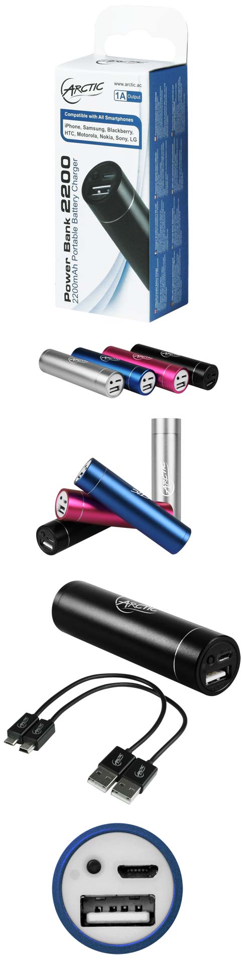 Размеры устройств серии Power Bank 2200 составляют 23.1x89мм, весят облачённые в алюминиевые корпуса новинки по 79 граммов. Творения ARCTIC доступны в чёрном, синем, розовом и серебристом цветовом исполнении. Время полной зарядки батареи составляет 4-5 часов, на корпусе устройств имеется светодиод, который демонстрирует, заряжается устройство или нет.